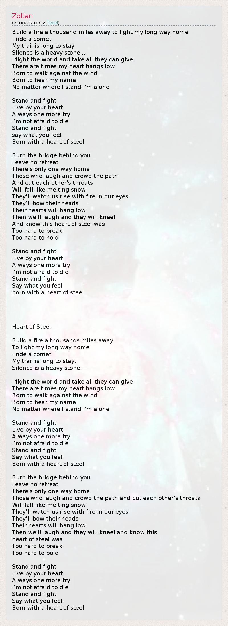 Разведи костер за тысячу миль вдали, осветить мой долгий путь домой Я оседлал комету Мой след слишком длинный, чтоб прерваться Тишина – это тяжелый камень… Я сражаюсь по всему миру и беру все, что они могут дать Бывают времена, когда мое сердце замирает Рожденный идти против ветра Рожденный услышать мое имя Где б я не стоял – я один Встань и сражайся Живи, как велит сердце Всегда еще раз попытайся Я не боюсь умереть Встань и сражайся Скажи, что ты чувствуешь Рожденный со стальным сердцем Жги мосты за собой Не отступай Есть только один путь домой Те, кто хохотали и топтались И резали друг другу глотки Падут, как тающий снег Они увидят, как мы возвысимся с огнем в наших глазах Они склонят головы Их сердца замрут Мы рассмеемся, они преклонят колени И знай, что это стальное сердце было Слишком тяжело сломить Слишком тяжело удержать Встань и сражайся Живи, как велит сердце Всегда еще раз попытайся Я не боюсь умереть Встань и сражайся Скажи, что ты чувствуешь Рожденный со стальным сердцем Сталь сердца* (перевод Александр из Запорожья) Высечь пламя за тыщи миль вдали Свети мне в путь домой. Внуздал комету. Мой след простор палит. Я раздавлен тишиной. Я против всех, но это всё моё. Мышце сердца вышел срок. Против Эвра жить рождён, Слышать имярек Всуе. Мне плевать. Я одинок. Встать и в бой! Верь лишь себе Сначала начинай Хоть сотый раз в судьбе. Встать и в бой! Смерть не страшит, Сталь сердца не болит. Жги дракар как только Ты встал на твердь. Лишь это путь домой. Мимо тех, кто на пути рвут глотки и плюют. Они - как снег весной. Они увидят как с пламенем в глазах Мы встанем, а они падут в поклон. Колени преклонят враги Но сталь наших сердец Всегда тверда. Не выжать стон. Встать и в бой! Верь лишь себе Сначала начинай Хоть сотый раз в судьбе. Встать и в бой! Смерть не страшит, Сталь сердца не болит. * поэтический перевод с элементами творческой интерпретации