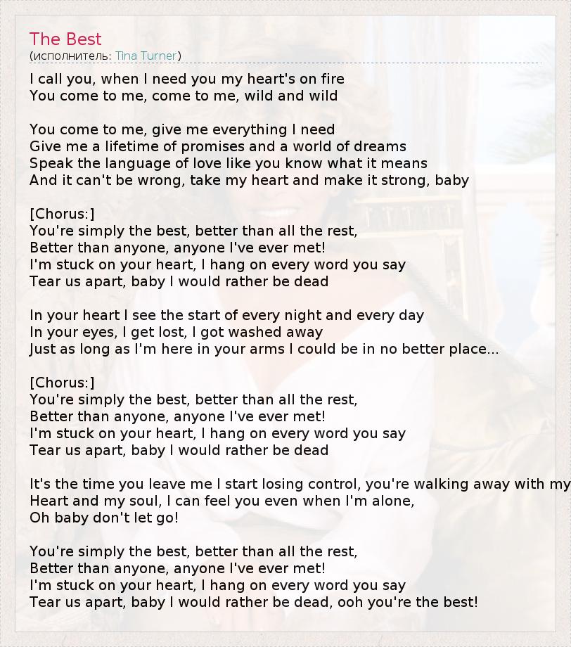 I call you, when I need you my heart's on fire You come to me, come to me, wild and wild You come to me, give me everything I need Give me a lifetime of promises and a world of dreams Speak the language of love like you know what it means And it can't be wrong, take my heart and make it strong, baby [Chorus:] You're simply the best, better than all the rest, Better than anyone, anyone I've ever met! I'm stuck on your heart, I hang on every word you say Tear us apart, baby I would rather be dead In your heart I see the start of every night and every day In your eyes, I get lost, I got washed away Just as long as I'm here in your arms I could be in no better place... [Chorus:] You're simply the best, better than all the rest, Better than anyone, anyone I've ever met! I'm stuck on your heart, I hang on every word you say Tear us apart, baby I would rather be dead It's the time you leave me I start losing control, you're walking away with my Heart and my soul, I can feel you even when I'm alone, Oh baby don't let go! You're simply the best, better than all the rest, Better than anyone, anyone I've ever met! I'm stuck on your heart, I hang on every word you say Tear us apart, baby I would rather be dead, ooh you're the best!