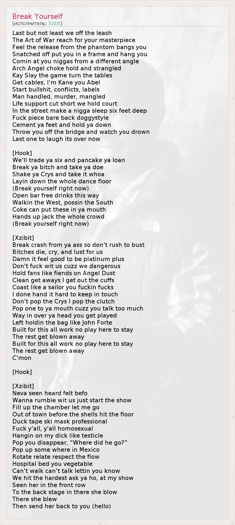 Последнее, но не менее мы с поводка Искусство войны достичь для вашего шедевра Почувствуйте освобождение от фантом челка вам Сорвал поставить вас в кадре и повесить вас Comin у вас нигеров под другим углом Арка Ангел дроссель держать и задушил Кей Убейте игра превратить столы Получить кабели, я Кейн вы Абель Начните фигня, конфликты, этикетки Человек обрабатываются, убийства, изуродованные Жизнеобеспечение оборвалась мы проводим суд На улице сделать ниггер спать шесть футов Ебать кусок голой спине собачьи Цементных Я. ноги и удерживайте Я. вниз Бросай ты с моста и смотреть, чтобы не утонуть Последний в смеяться над предприятием ИТС [Припев] Мы торговли Я. шесть и блин Я. кредит Перерыв я сука и принять я лань Встряхнуть Я. Crys и принять его Вау Layin вниз весь танцпол (Break себя прямо сейчас) Открытый бар бесплатные напитки этот путь Walkin Запад, Юг possin Кокс может поставить их в рот Я. Руки вверх гнездо вся толпа (Break себя прямо сейчас) [Xzibit] Перерыв краш я задницу, так что не спешите бюст Суки умереть, плакать, и похоть для нас Черт его чувствовать себя хорошо, чтобы быть платина плюс Не ебать остроумия нас cuzz мы опасно Держите поклонников как извергов на Angel Dust Чистые GET сувенирной я выхожу манжеты Побережье, как моряк вы гребаный трахает Я сделал рукой трудно поддерживать связь Не поп Crys я поп сцепления Поп один Я. рот cuzz вы говорите слишком много Путь в более Ya Head Вы получаете играл Слева Holdin сумку как Джон Форте Построенный для этого все работают не играть здесь, чтобы остаться Остальные получить ветром Построенный для этого все работают не играть здесь, чтобы остаться Остальные получить ветром Да ладно [Припев] [Xzibit] Нева активность слышал чувствовал Befo Хотите гул остроумие нас просто запустите шоу Заполните камера отпусти меня Из города до того, как снаряды упали на пол Утка ленты лыжный маска профессиональный Пошел y'all, y'all гомосексуальный Hangin на мой член, как яичка Поп ты исчезнешь, и Quot; Куда он делся и Quot; Всплывающие некоторые где в Мексике Поворот относятся уважать поток Больничная койка вам растительные Не может идти не может говорить Lettin вы знаете, Мы попали в трудное спросить я хо, на моем шоу Видел ее в первом ряду Для задней этапе там она взорвать Там она взорвали Затем отправить ее обратно к вам (привет)