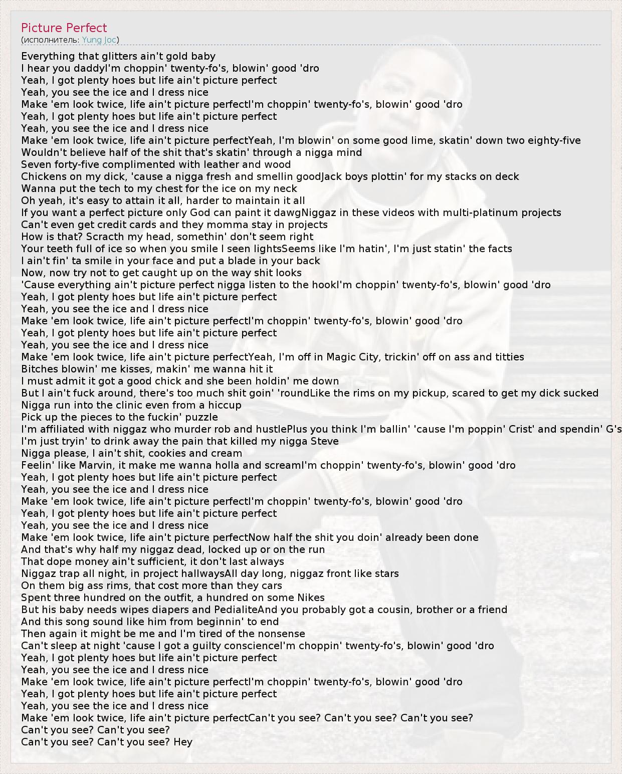 'Cause everything ain't picture perfect nigga listen to the hookI'm choppin' twenty-fo's, blowin' good 'dro