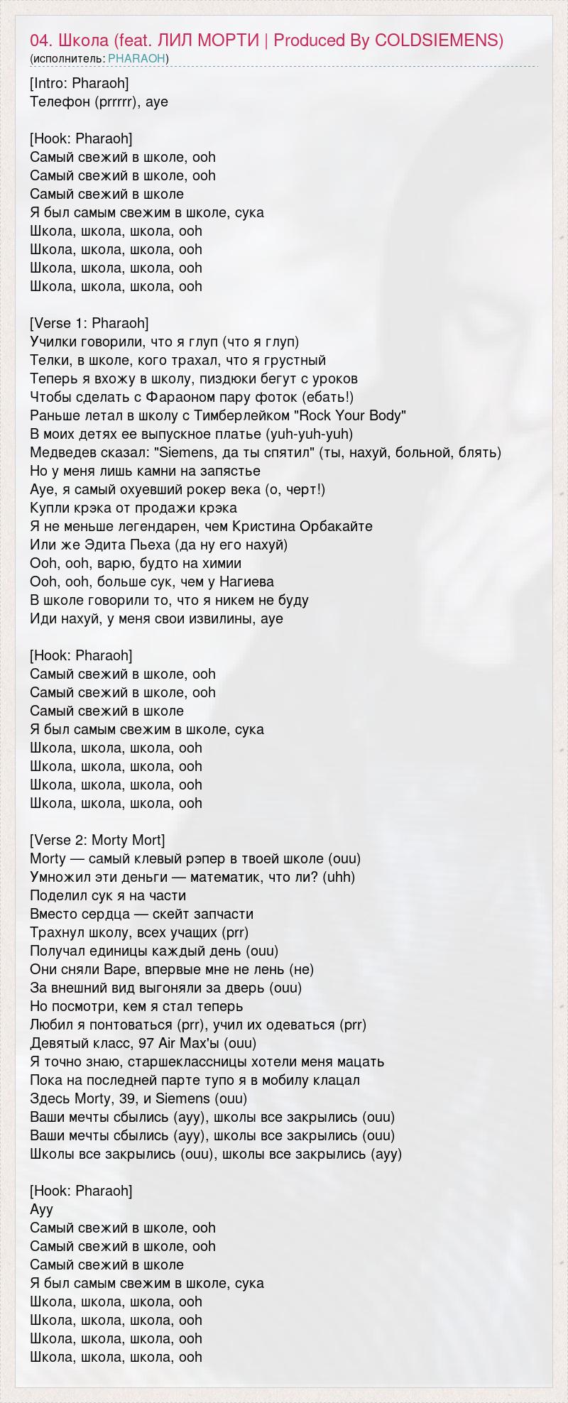 ГлавнаяИсполнителиPharaoh04. Школа (feat. ЛИЛ МОРТИ | Produced By COLDSIEMENS)