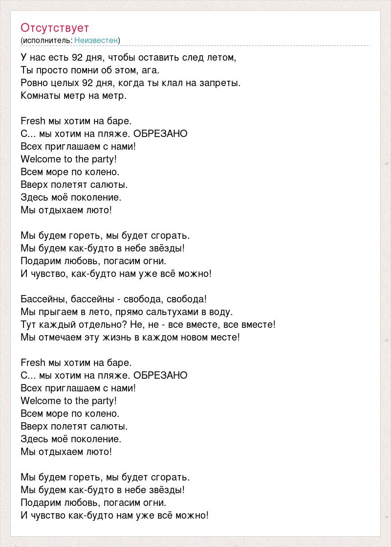 У нас есть 92 дня, чтобы оставить cлед летом, Ты просто помни об этом, ага. Ровно целых 92 дня, когда ты клал на запреты. Комнаты метр на метр. Fresh мы хотим на баре. С... мы хотим на пляже. ОБРЕЗАНО Всех приглашаем с нами! Welcome to the party! Всем море по колено. Вверх полетят салюты. Здесь моё поколение. Мы отдыхаем люто! Мы будем гореть, мы будет сгорать. Мы будем как-будто в небе звёзды! Подарим любовь, погасим огни. И чувство, как-будто нам уже всё можно! Бассейны, бассейны - свобода, свобода! Мы прыгаем в лето, прямо сальтухами в воду. Тут каждый отдельно? Не, не - все вместе, все вместе! Мы отмечаем эту жизнь в каждом новом месте! Fresh мы хотим на баре. С... мы хотим на пляже. ОБРЕЗАНО Всех приглашаем с нами! Welcome to the party! Всем море по колено. Вверх полетят салюты. Здесь моё поколение. Мы отдыхаем люто! Мы будем гореть, мы будет сгорать. Мы будем как-будто в небе звёзды! Подарим любовь, погасим огни. И чувство как-будто нам уже всё можно!
