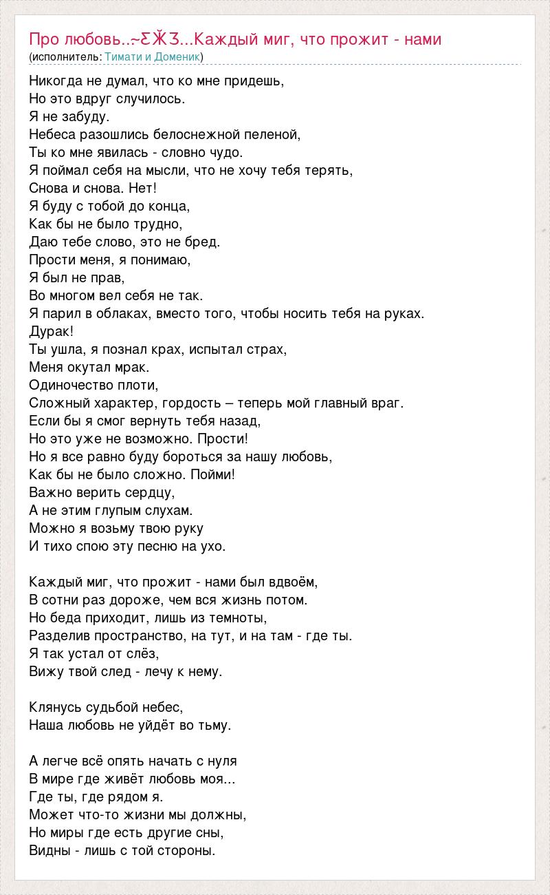 Никогда не думал, что ко мне придешь, Но это вдруг случилось. Я не забуду. Небеса разошлись белоснежной пеленой, Ты ко мне явилась - словно чудо. Я поймал себя на мысли, что не хочу тебя терять, Снова и снова. Нет! Я буду с тобой до конца, Как бы не было трудно, Даю тебе слово, это не бред. Прости меня, я понимаю, Я был не прав, Во многом вел себя не так. Я парил в облаках, вместо того, чтобы носить тебя на руках. Дурак! Ты ушла, я познал крах, испытал страх, Меня окутал мрак. Одиночество плоти, Сложный характер, гордость – теперь мой главный враг. Если бы я смог вернуть тебя назад, Но это уже не возможно. Прости! Но я все равно буду бороться за нашу любовь, Как бы не было сложно. Пойми! Важно верить сердцу, А не этим глупым слухам. Можно я возьму твою руку И тихо спою эту песню на ухо. Каждый миг, что прожит - нами был вдвоём, В сотни раз дороже, чем вся жизнь потом. Но беда приходит, лишь из темноты, Разделив пространство, на тут, и на там - где ты. Я так устал от слёз, Вижу твой след - лечу к нему. Клянусь судьбой небес, Наша любовь не уйдёт во тьму. А легче всё опять начать с нуля В мире где живёт любовь моя... Где ты, где рядом я. Может что-то жизни мы должны, Но миры где есть другие сны, Видны - лишь с той стороны.
