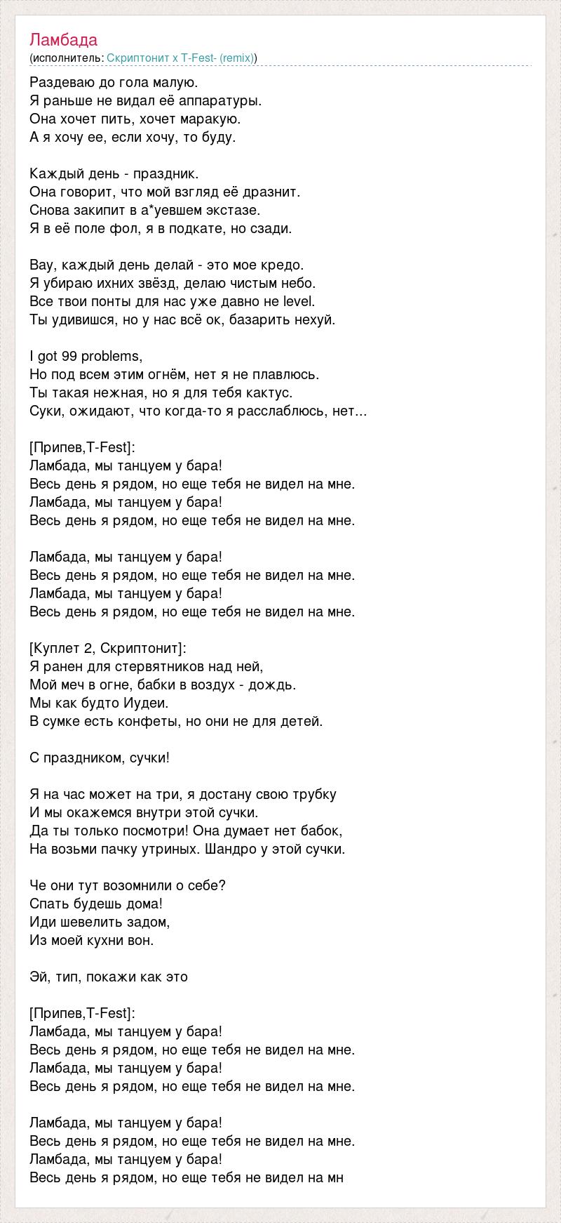 Раздеваю до гола малую. Я раньше не видал её аппаратуры. Она хочет пить, хочет маракую. А я хочу ее, если хочу, то буду. Каждый день - праздник. Она говорит, что мой взгляд её дразнит. Снова закипит в а*уевшем экстазе. Я в её поле фол, я в подкате, но сзади. Вау, каждый день делай - это мое кредо. Я убираю ихних звёзд, делаю чистым небо. Все твои понты для нас уже давно не level. Ты удивишся, но у нас всё ок, базарить нехуй. I got 99 problems, Но под всем этим огнём, нет я не плавлюсь. Ты такая нежная, но я для тебя кактус. Суки, ожидают, что когда-то я расслаблюсь, нет... [Припев,T-Fest]: Ламбада, мы танцуем у бара! Весь день я рядом, но еще тебя не видел на мне. Ламбада, мы танцуем у бара! Весь день я рядом, но еще тебя не видел на мне. Ламбада, мы танцуем у бара! Весь день я рядом, но еще тебя не видел на мне. Ламбада, мы танцуем у бара! Весь день я рядом, но еще тебя не видел на мне. [Куплет 2, Скриптонит]: Я ранен для стервятников над ней, Мой меч в огне, бабки в воздух - дождь. Мы как будто Иудеи. В сумке есть конфеты, но они не для детей. С праздником, сучки! Я на час может на три, я достану свою трубку И мы окажемся внутри этой сучки. Да ты только посмотри! Она думает нет бабок, На возьми пачку утриных. Шандро у этой сучки. Че они тут возомнили о себе? Спать будешь дома! Иди шевелить задом, Из моей кухни вон. Эй, тип, покажи как это [Припев,T-Fest]: Ламбада, мы танцуем у бара! Весь день я рядом, но еще тебя не видел на мне. Ламбада, мы танцуем у бара! Весь день я рядом, но еще тебя не видел на мне. Ламбада, мы танцуем у бара! Весь день я рядом, но еще тебя не видел на мне. Ламбада, мы танцуем у бара! Весь день я рядом, но еще тебя не видел на мн