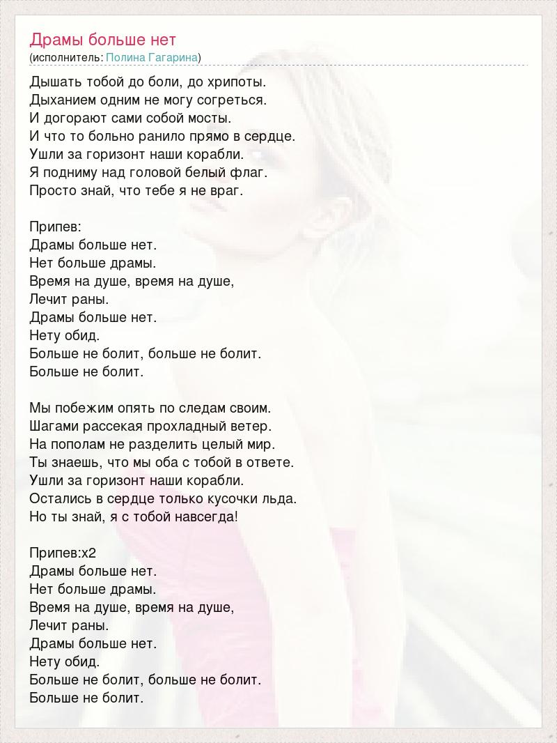 Дышать тобой до боли, до хрипоты. Дыханием одним не могу согреться. И догорают сами собой мосты. И что то больно ранило прямо в сердце. Ушли за горизонт наши корабли. Я подниму над головой белый флаг. Просто знай, что тебе я не враг. Припев: Драмы больше нет. Нет больше драмы. Время на душе, время на душе, Лечит раны. Драмы больше нет. Нету обид. Больше не болит, больше не болит. Больше не болит. Мы побежим опять по следам своим. Шагами рассекая прохладный ветер. На пополам не разделить целый мир. Ты знаешь, что мы оба с тобой в ответе. Ушли за горизонт наши корабли. Остались в сердце только кусочки льда. Но ты знай, я с тобой навсегда! Припев:х2 Драмы больше нет. Нет больше драмы. Время на душе, время на душе, Лечит раны. Драмы больше нет. Нету обид. Больше не болит, больше не болит. Больше не болит.