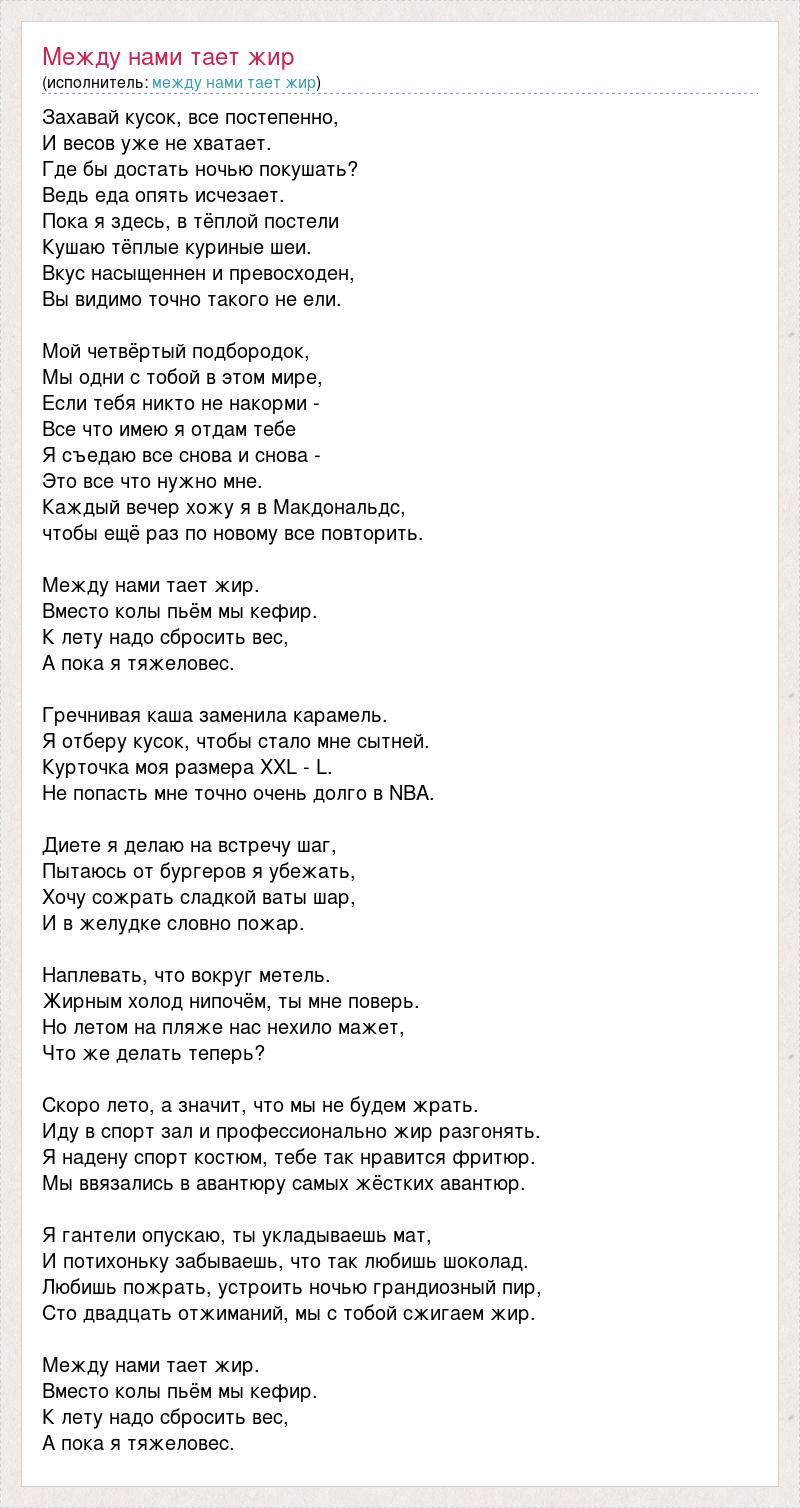 Захавай кусок, все постепенно, И весов уже не хватает. Где бы достать ночью покушать? Ведь еда опять исчезает. Пока я здесь, в тёплой постели Кушаю тёплые куриные шеи. Вкус насыщеннен и превосходен, Вы видимо точно такого не ели. Мой четвёртый подбородок, Мы одни с тобой в этом мире, Если тебя никто не накорми - Все что имею я отдам тебе Я съедаю все снова и снова - Это все что нужно мне. Каждый вечер хожу я в Макдональдс, чтобы ещё раз по новому все повторить. Между нами тает жир. Вместо колы пьём мы кефир. К лету надо сбросить вес, А пока я тяжеловес. Гречнивая каша заменила карамель. Я отберу кусок, чтобы стало мне сытней. Курточка моя размера ХХL - L. Не попасть мне точно очень долго в NBA. Диете я делаю на встречу шаг, Пытаюсь от бургеров я убежать, Хочу сожрать сладкой ваты шар, И в желудке словно пожар. Наплевать, что вокруг метель. Жирным холод нипочём, ты мне поверь. Но летом на пляже нас нехило мажет, Что же делать теперь? Скоро лето, а значит, что мы не будем жрать. Иду в спорт зал и профессионально жир разгонять. Я надену спорт костюм, тебе так нравится фритюр. Мы ввязались в авантюру самых жёстких авантюр. Я гантели опускаю, ты укладываешь мат, И потихоньку забываешь, что так любишь шоколад. Любишь пожрать, устроить ночью грандиозный пир, Сто двадцать отжиманий, мы с тобой сжигаем жир. Между нами тает жир. Вместо колы пьём мы кефир. К лету надо сбросить вес, А пока я тяжеловес.
