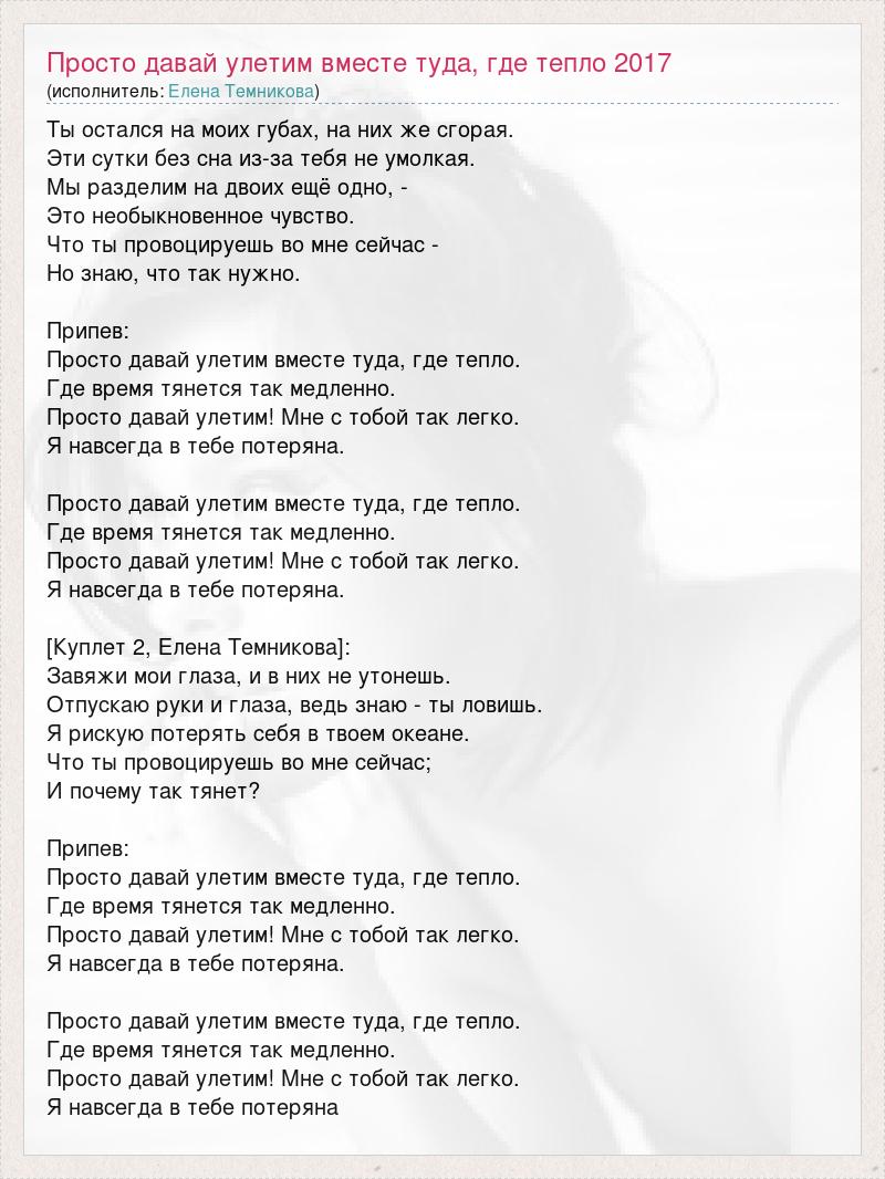 Ты остался на моих губах, на них же сгорая. Эти сутки без сна из-за тебя не умолкая. Мы разделим на двоих ещё одно, - Это необыкновенное чувство. Что ты провоцируешь во мне сейчас - Но знаю, что так нужно. Припев: Просто давай улетим вместе туда, где тепло. Где время тянется так медленно. Просто давай улетим! Мне с тобой так легко. Я навсегда в тебе потеряна. Просто давай улетим вместе туда, где тепло. Где время тянется так медленно. Просто давай улетим! Мне с тобой так легко. Я навсегда в тебе потеряна. [Куплет 2, Елена Темникова]: Завяжи мои глаза, и в них не утонешь. Отпускаю руки и глаза, ведь знаю - ты ловишь. Я рискую потерять себя в твоем океане. Что ты провоцируешь во мне сейчас; И почему так тянет? Припев: Просто давай улетим вместе туда, где тепло. Где время тянется так медленно. Просто давай улетим! Мне с тобой так легко. Я навсегда в тебе потеряна. Просто давай улетим вместе туда, где тепло. Где время тянется так медленно. Просто давай улетим! Мне с тобой так легко. Я навсегда в тебе потеряна