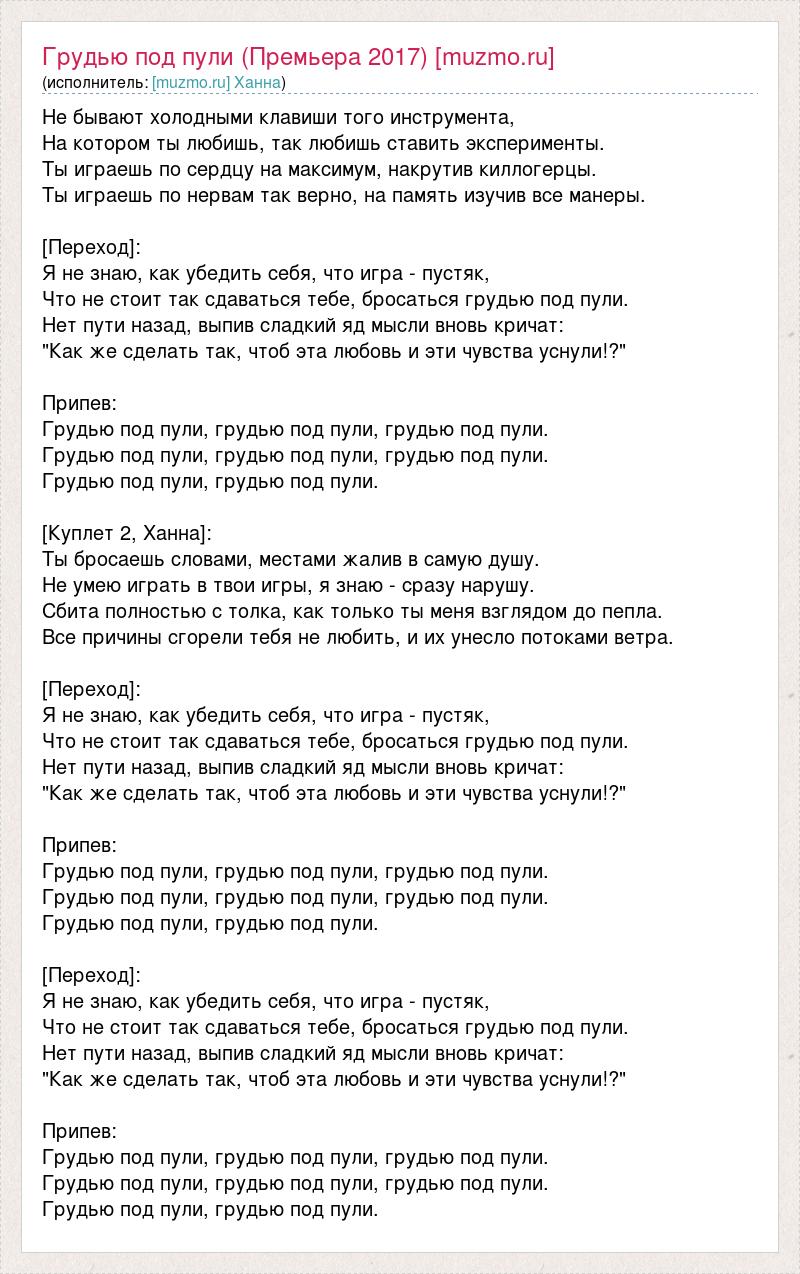Не бывают холодными клавиши того инструмента, На котором ты любишь, так любишь ставить эксперименты. Ты играешь по сердцу на максимум, накрутив киллогерцы. Ты играешь по нервам так верно, на память изучив все манеры. [Переход]: Я не знаю, как убедить себя, что игра - пустяк, Что не стоит так сдаваться тебе, бросаться грудью под пули. Нет пути назад, выпив сладкий яд мысли вновь кричат: "Как же сделать так, чтоб эта любовь и эти чувства уснули!?" Припев: Грудью под пули, грудью под пули, грудью под пули. Грудью под пули, грудью под пули, грудью под пули. Грудью под пули, грудью под пули. [Куплет 2, Ханна]: Ты бросаешь словами, местами жалив в самую душу. Не умею играть в твои игры, я знаю - сразу нарушу. Сбита полностью с толка, как только ты меня взглядом до пепла. Все причины сгорели тебя не любить, и их унесло потоками ветра. [Переход]: Я не знаю, как убедить себя, что игра - пустяк, Что не стоит так сдаваться тебе, бросаться грудью под пули. Нет пути назад, выпив сладкий яд мысли вновь кричат: "Как же сделать так, чтоб эта любовь и эти чувства уснули!?" Припев: Грудью под пули, грудью под пули, грудью под пули. Грудью под пули, грудью под пули, грудью под пули. Грудью под пули, грудью под пули. [Переход]: Я не знаю, как убедить себя, что игра - пустяк, Что не стоит так сдаваться тебе, бросаться грудью под пули. Нет пути назад, выпив сладкий яд мысли вновь кричат: "Как же сделать так, чтоб эта любовь и эти чувства уснули!?" Припев: Грудью под пули, грудью под пули, грудью под пули. Грудью под пули, грудью под пули, грудью под пули. Грудью под пули, грудью под пули.