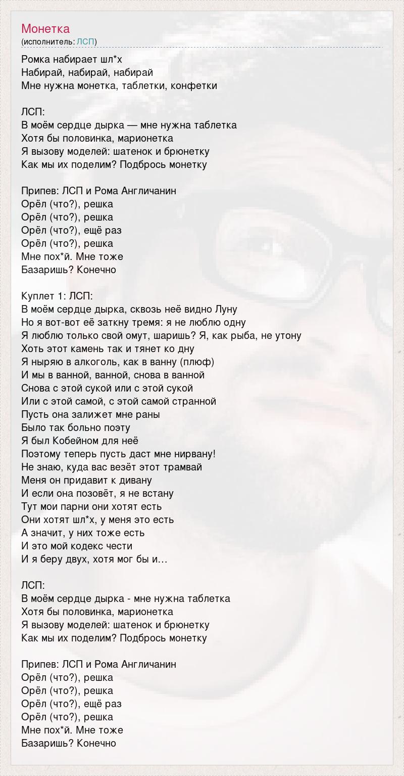 Ромка набирает шл*х Набирай, набирай, набирай Мне нужна монетка, таблетки, конфетки ЛСП: В моём сердце дырка — мне нужна таблетка Хотя бы половинка, марионетка Я вызову моделей: шатенок и брюнетку Как мы их поделим? Подбрось монетку Припев: ЛСП и Рома Англичанин Орёл (что?), решка Орёл (что?), решка Орёл (что?), ещё раз Орёл (что?), решка Мне пох*й. Мне тоже Базаришь? Конечно Куплет 1: ЛСП: В моём сердце дырка, сквозь неё видно Луну Но я вот-вот её заткну тремя: я не люблю одну Я люблю только свой омут, шаришь? Я, как рыба, не утону Хоть этот камень так и тянет ко дну Я ныряю в алкоголь, как в ванну (плюф) И мы в ванной, ванной, снова в ванной Снова с этой сукой или с этой сукой Или с этой самой, с этой самой странной Пусть она залижет мне раны Было так больно поэту Я был Кобейном для неё Поэтому теперь пусть даст мне нирвану! Не знаю, куда вас везёт этот трамвай Меня он придавит к дивану И если она позовёт, я не встану Тут мои парни они хотят есть Они хотят шл*х, у меня это есть А значит, у них тоже есть И это мой кодекс чести И я беру двух, хотя мог бы и… ЛСП: В моём сердце дырка - мне нужна таблетка Хотя бы половинка, марионетка Я вызову моделей: шатенок и брюнетку Как мы их поделим? Подбрось монетку Припев: ЛСП и Рома Англичанин Орёл (что?), решка Орёл (что?), решка Орёл (что?), ещё раз Орёл (что?), решка Мне пох*й. Мне тоже Базаришь? Конечно