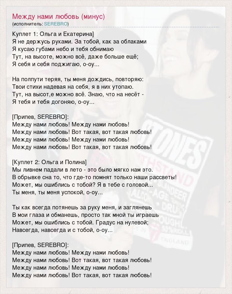Куплет 1: Ольга и Екатерина] Я не держусь руками. За тобой, как за облаками Я кусаю губами небо и тебя обнимаю Тут, на высоте, можно всё, даже больше ещё; Я себя и себя поджигаю, о-оу... На полпути теряя, ты меня дождись, повторяю: Твои стихи надевая на себя, я в них утопаю. Тут, на высот,е можно всё. Знаю, что на несёт - Я тебя и тебя догоняю, о-оу... [Припев, SEREBRO]: Между нами любовь! Между нами любовь! Между нами любовь! Вот такая, вот такая любовь! Между нами любовь! Между нами любовь! Между нами любовь! Вот такая, вот такая любовь! [Куплет 2: Ольга и Полина] Мы ливнем падали в лето - это было мягко нам это. В обрывке сна то, что где-то помнят только наши рассветы! Может, мы ошиблись с тобой? Я в тебе с головой... Ты меня, ты меня успокой, о-оу... Ты как всегда потянешь за руку меня, и заглянешь В мои глаза и обманешь, просто так мной ты играешь Может, мы ошиблись с тобой. Градус на нулевой; Навсегда, навсегда и с тобой, о-оу... [Припев, SEREBRO]: Между нами любовь! Между нами любовь! Между нами любовь! Вот такая, вот такая любовь! Между нами любовь! Между нами любовь! Между нами любовь! Вот такая, вот такая любовь!