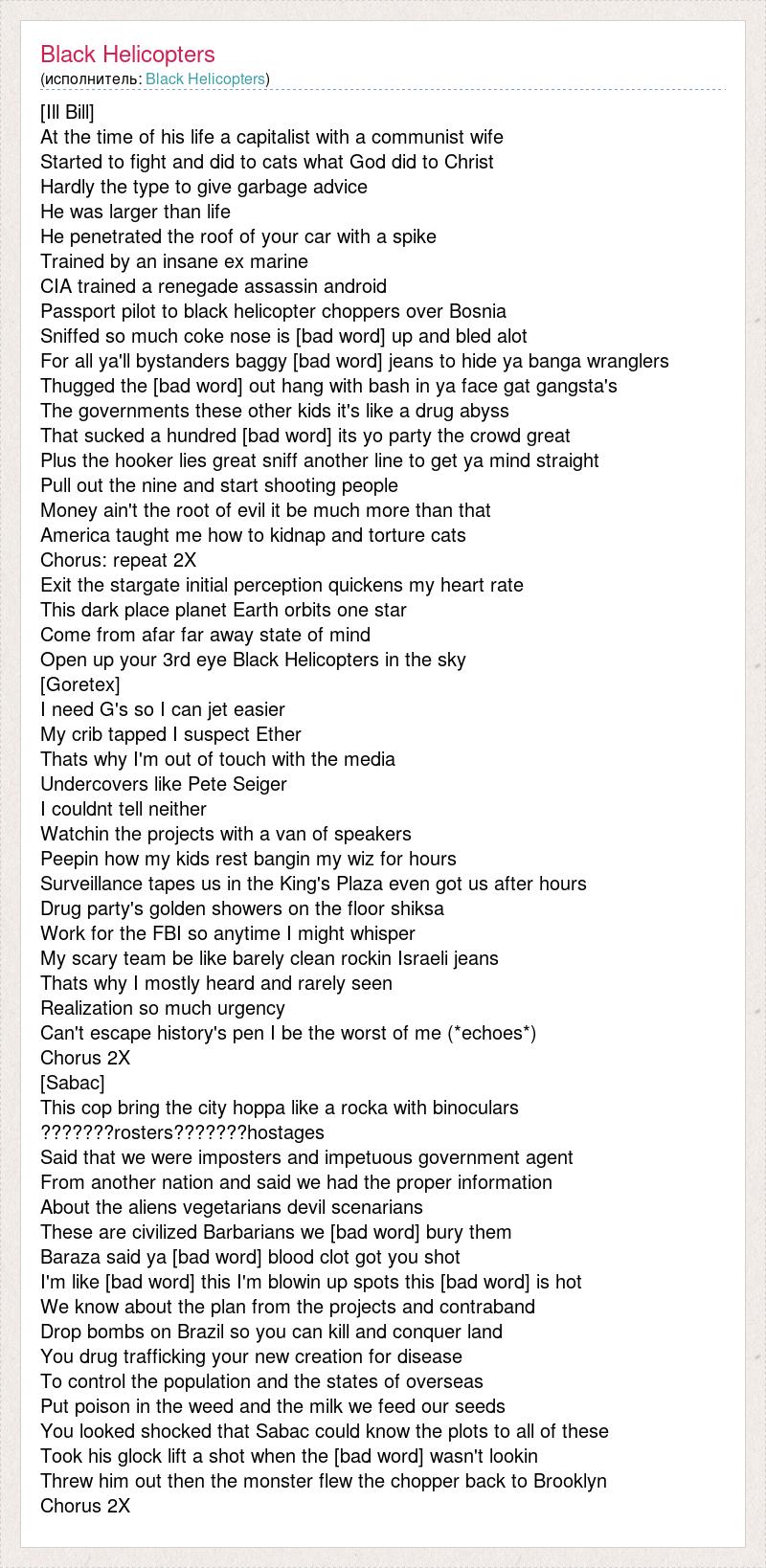 [Ill Bill] At the time of his life a capitalist with a communist wife Started to fight and did to cats what God did to Christ Hardly the type to give garbage advice He was larger than life He penetrated the roof of your car with a spike Trained by an insane ex marine CIA trained a renegade assassin android Passport pilot to black helicopter choppers over Bosnia Sniffed so much coke nose is [bad word] up and bled alot For all ya'll bystanders baggy [bad word] jeans to hide ya banga wranglers Thugged the [bad word] out hang with bash in ya face gat gangsta's The governments these other kids it's like a drug abyss That sucked a hundred [bad word] its yo party the crowd great Plus the hooker lies great sniff another line to get ya mind straight Pull out the nine and start shooting people Money ain't the root of evil it be much more than that America taught me how to kidnap and torture cats Chorus: repeat 2X Exit the stargate initial perception quickens my heart rate This dark place planet Earth orbits one star Come from afar far away state of mind Open up your 3rd eye Black Helicopters in the sky [Goretex] I need G's so I can jet easier My crib tapped I suspect Ether Thats why I'm out of touch with the media Undercovers like Pete Seiger I couldnt tell neither Watchin the projects with a van of speakers Peepin how my kids rest bangin my wiz for hours Surveillance tapes us in the King's Plaza even got us after hours Drug party's golden showers on the floor shiksa Work for the FBI so anytime I might whisper My scary team be like barely clean rockin Israeli jeans Thats why I mostly heard and rarely seen Realization so much urgency Can't escape history's pen I be the worst of me (*echoes*) Chorus 2X [Sabac] This cop bring the city hoppa like a rocka with binoculars ???????rosters???????hostages Said that we were imposters and impetuous government agent From another nation and said we had the proper information About the aliens vegetarians devil scenarians These are civilized Barbarians we [bad word] bury them Baraza said ya [bad word] blood clot got you shot I'm like [bad word] this I'm blowin up spots this [bad word] is hot We know about the plan from the projects and contraband Drop bombs on Brazil so you can kill and conquer land You drug trafficking your new creation for disease To control the population and the states of overseas Put poison in the weed and the milk we feed our seeds You looked shocked that Sabac could know the plots to all of these Took his glock lift a shot when the [bad word] wasn't lookin Threw him out then the monster flew the chopper back to Brooklyn Chorus 2X