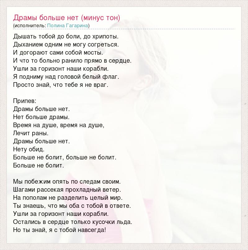Дышать тобой до боли, до хрипоты. Дыханием одним не могу согреться. И догорают сами собой мосты. И что то больно ранило прямо в сердце. Ушли за горизонт наши корабли. Я подниму над головой белый флаг. Просто знай, что тебе я не враг. Припев: Драмы больше нет. Нет больше драмы. Время на душе, время на душе, Лечит раны. Драмы больше нет. Нету обид. Больше не болит, больше не болит. Больше не болит. Мы побежим опять по следам своим. Шагами рассекая прохладный ветер. На пополам не разделить целый мир. Ты знаешь, что мы оба с тобой в ответе. Ушли за горизонт наши корабли. Остались в сердце только кусочки льда. Но ты знай, я с тобой навсегда!