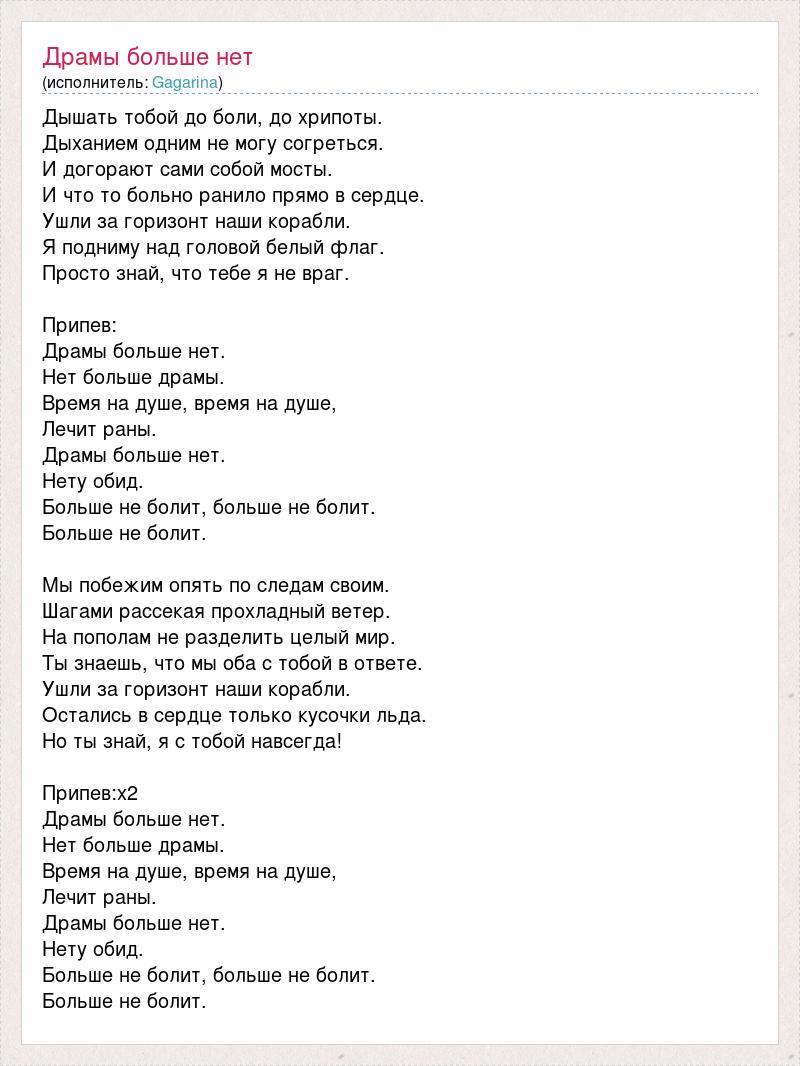 Дышать тобой до боли, до хрипоты. Дыханием одним не могу согреться. И догорают сами собой мосты. И что то больно ранило прямо в сердце. Ушли за горизонт наши корабли. Я подниму над головой белый флаг. Просто знай, что тебе я не враг. Припев: Драмы больше нет. Нет больше драмы. Время на душе, время на душе, Лечит раны. Драмы больше нет. Нету обид. Больше не болит, больше не болит. Больше не болит. Мы побежим опять по следам своим. Шагами рассекая прохладный ветер. На пополам не разделить целый мир. Ты знаешь, что мы оба с тобой в ответе. Ушли за горизонт наши корабли. Остались в сердце только кусочки льда. Но ты знай, я с тобой навсегда! Припев:х2 Драмы больше нет. Нет больше драмы. Время на душе, время на душе, Лечит раны. Драмы больше нет. Нету обид. Больше не болит, больше не болит. Больше не болит.