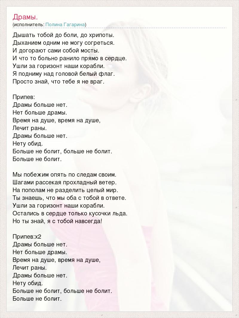 Дышать тобой до боли, до хрипоты. Дыханием одним не могу согреться. И догорают сами собой мосты. И что то больно ранило прямо в сердце. Ушли за горизонт наши корабли. Я подниму над головой белый флаг. Просто знай, что тебе я не враг. Припев: Драмы больше нет. Нет больше драмы. Время на душе, время на душе, Лечит раны. Драмы больше нет. Нету обид. Больше не болит, больше не болит. Больше не болит. Мы побежим опять по следам своим. Шагами рассекая прохладный ветер. На пополам не разделить целый мир. Ты знаешь, что мы оба с тобой в ответе. Ушли за горизонт наши корабли. Остались в сердце только кусочки льда. Но ты знай, я с тобой навсегда! Припев:х2 Драмы больше нет. Нет больше драмы. Время на душе, время на душе, Лечит раны. Драмы больше нет. Нету обид. Больше не болит, больше не болит. Больше не болит.