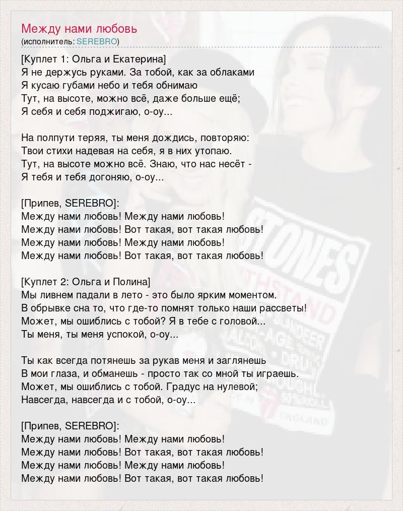 [Куплет 1: Ольга и Екатерина] Я не держусь руками. За тобой, как за облаками Я кусаю губами небо и тебя обнимаю Тут, на высоте, можно всё, даже больше ещё; Я себя и себя поджигаю, о-оу... На полпути теряя, ты меня дождись, повторяю: Твои стихи надевая на себя, я в них утопаю. Тут, на высоте можно всё. Знаю, что нас несёт - Я тебя и тебя догоняю, о-оу... [Припев, SEREBRO]: Между нами любовь! Между нами любовь! Между нами любовь! Вот такая, вот такая любовь! Между нами любовь! Между нами любовь! Между нами любовь! Вот такая, вот такая любовь! [Куплет 2: Ольга и Полина] Мы ливнем падали в лето - это было ярким моментом. В обрывке сна то, что где-то помнят только наши рассветы! Может, мы ошиблись с тобой? Я в тебе с головой... Ты меня, ты меня успокой, о-оу... Ты как всегда потянешь за рукав меня и заглянешь В мои глаза, и обманешь - просто так со мной ты играешь. Может, мы ошиблись с тобой. Градус на нулевой; Навсегда, навсегда и с тобой, о-оу... [Припев, SEREBRO]: Между нами любовь! Между нами любовь! Между нами любовь! Вот такая, вот такая любовь! Между нами любовь! Между нами любовь! Между нами любовь! Вот такая, вот такая любовь!